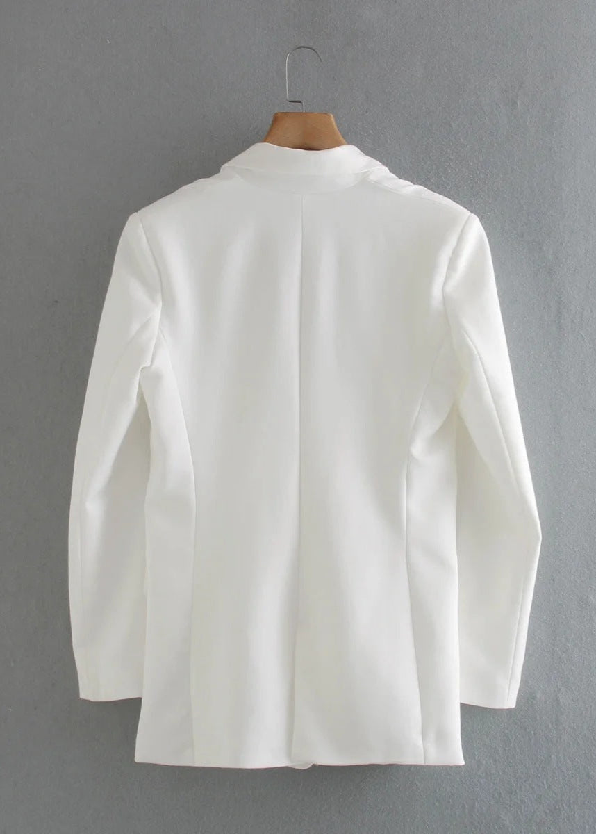 Verleihen Sie Ihrer Garderobe mit diesem weißen Blazer im britisch inspirierten Schnitt einen Hauch von Eleganz. Sein strukturiertes Design, verziert mit goldenen Knöpfen, verkörpert die perfekte Balance zwischen Raffinesse und Modernität.