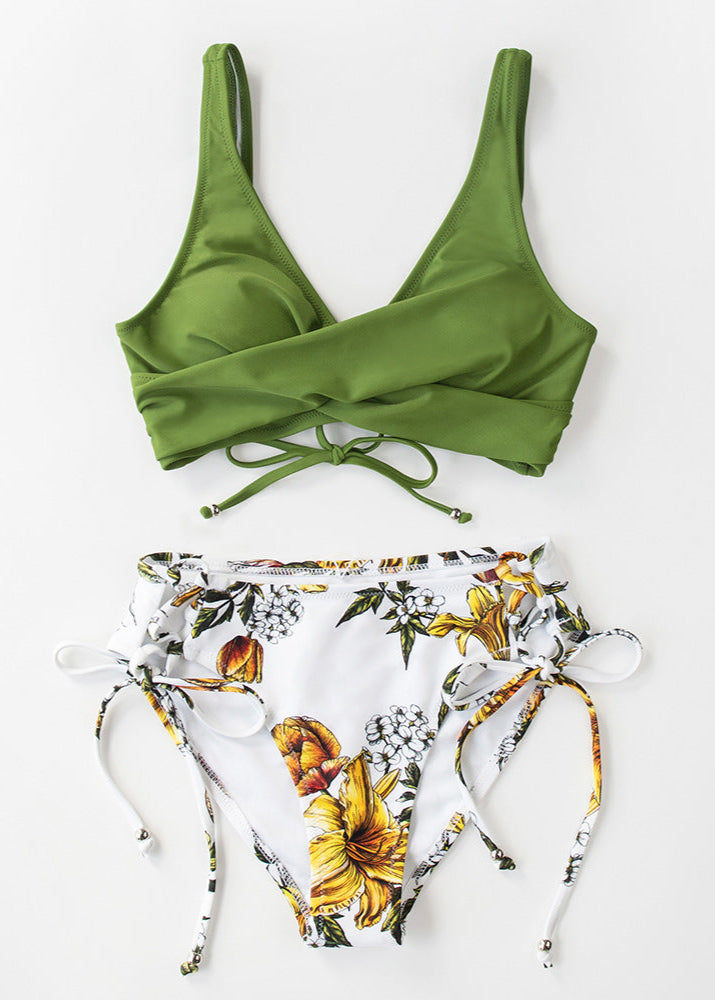 Bikini Tropical à Nœuds Latéraux – Haut Croisé & Motifs Fruits