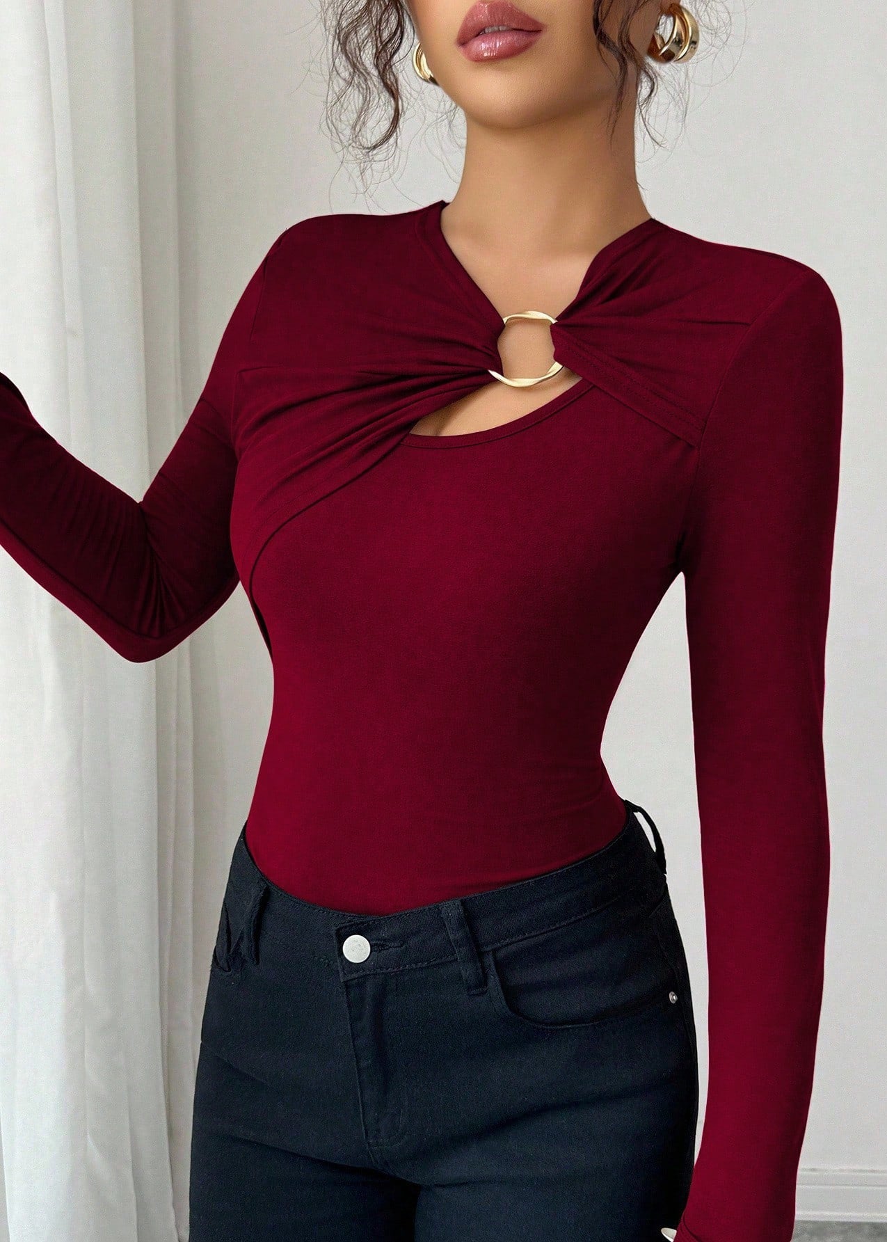 Ce haut chocolat captif dès le premier regard par son design sophistiqué et son jeu de drapés élégant . Le détail de l'anneau doré au décolleté ajoute une touche de modernité et de sensualité subtile , parfaite pour illuminer la tenue sans en faire trop.