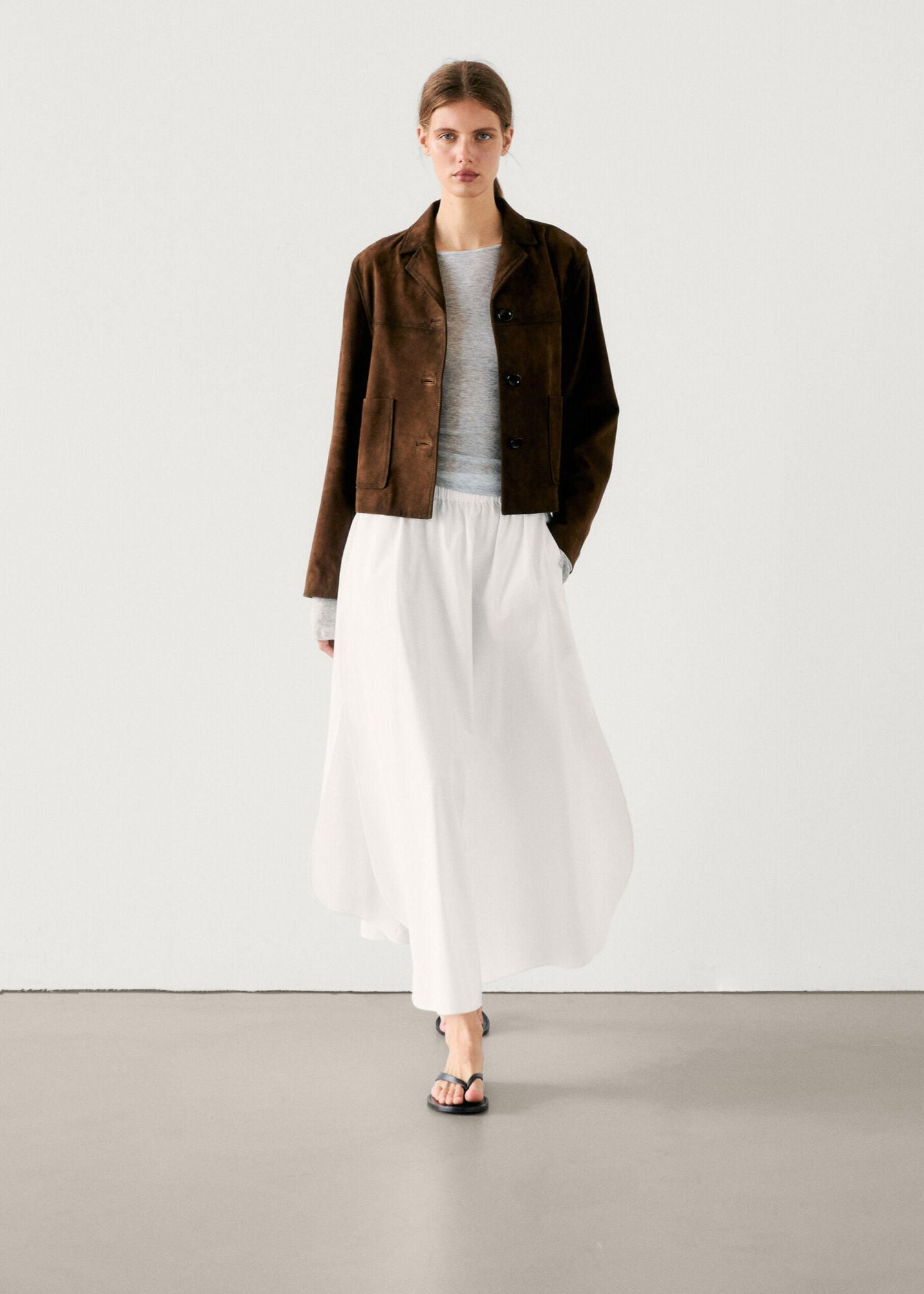 Conçue en daim doux et raffiné , elle offre un toucher velouté et un tombé impeccable. Ses boutons contrastés et ses poches plaquées pratiques apportent une note de caractère tout en préservant une allure chic et soignée.