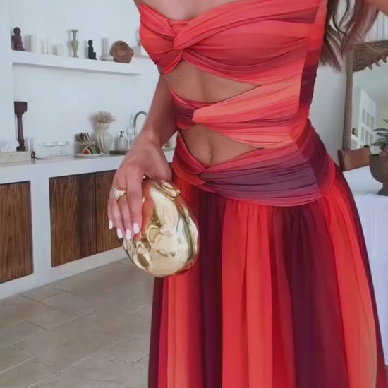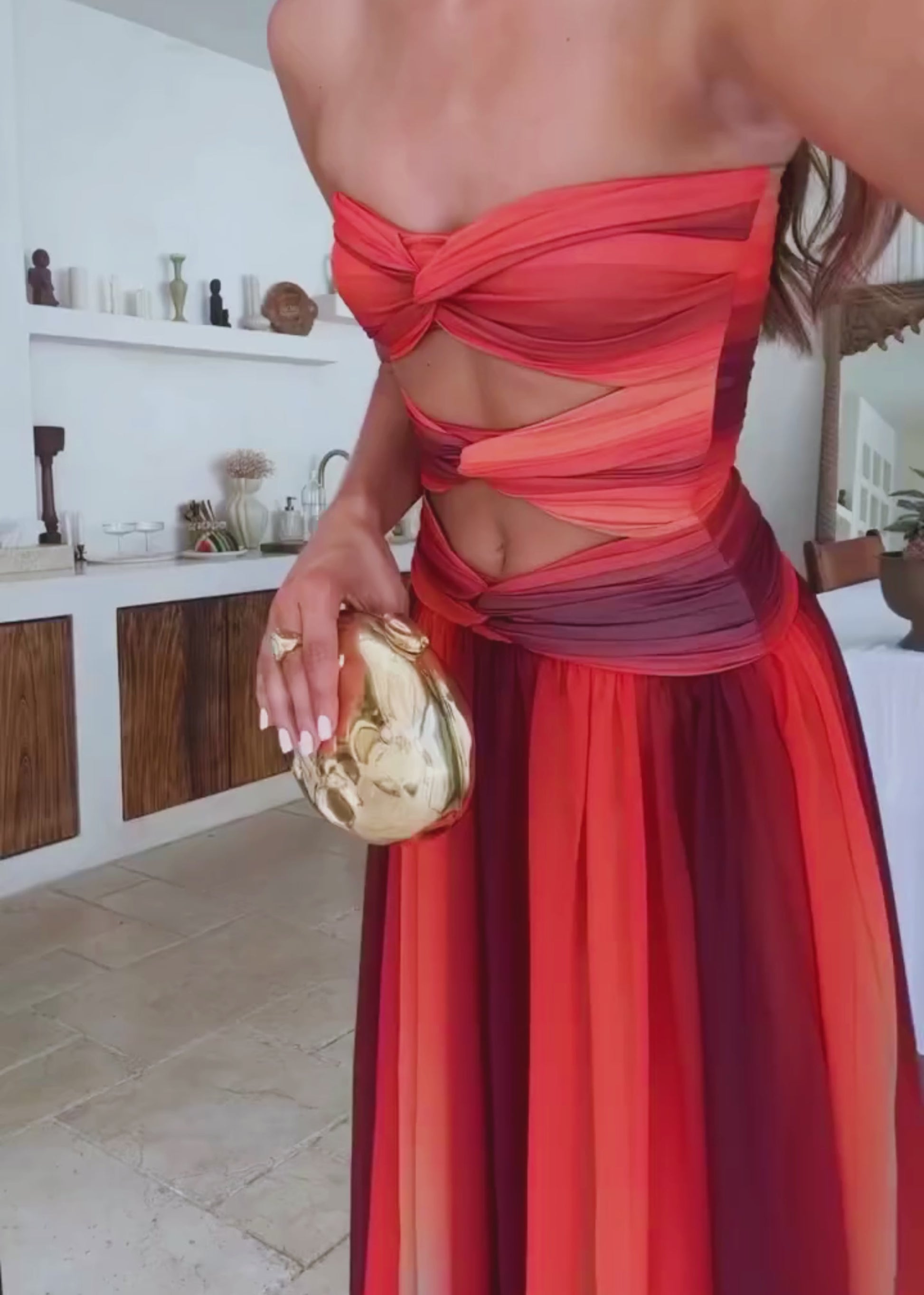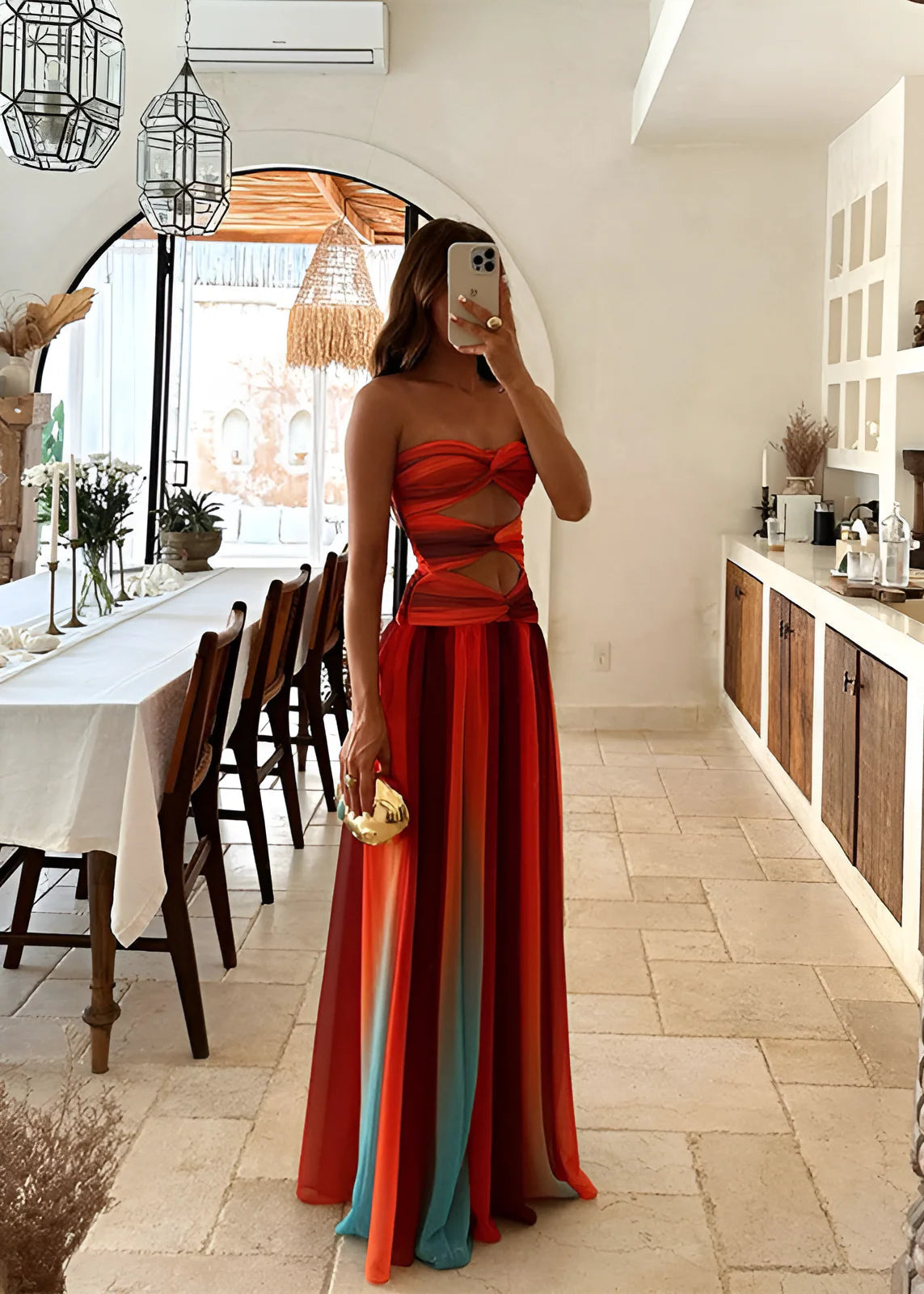 Allure envoûtante et esprit glamour pour cette robe longue au dégradé flamboyant rouge et turquoise. Avec ses découpes audacieuses, son dos nu et son effet bandeau, elle sublime la silhouette avec élégance. Idéale pour les soirées estivales, les cocktails ou les événements chic, elle est conçue pour celles qui aiment se démarquer.