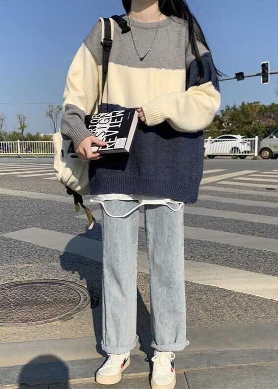 - Détails : Design color-block à trois tons (gris, crème et bleu marine), col rond, manches longues tombantes